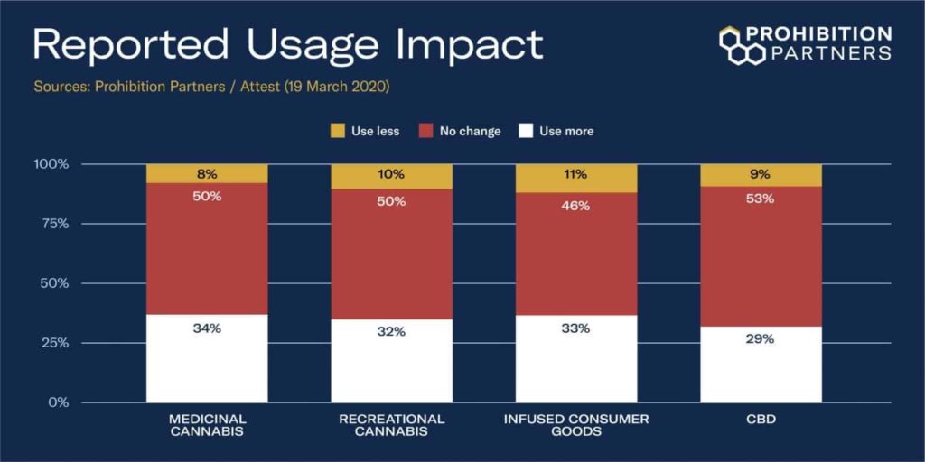 Na základě údajů, které Prohibition Partners (19. března 2020) shromáždili v průzkumu více než 2 500 lidí ve Spojených státech, Velké Británii a Kanadě, očekáváme, že COVID-19 nebude mít dramatický dopad na spotřebu konopí nebo CBD pro osobní potřebu, ale očekáváme, že se spotřeba mírně zvýší.