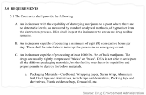 „Integrita ničivého procesu musí být taková, aby jakmile je materiál zničen, nemohl být znovu použit nebo obnoven,“ říká se v tenderu DEA. Tráva musí být zničena „až do úrovně, kdy neexistuje v detekovatelné hladině, měřené standardními analytickými metodami, nebo jako vedlejší produkt destrukčního procesu. DEA bude provádět u spalovače inspekce, aby zajistila, že žádné drogy nezbydou.“