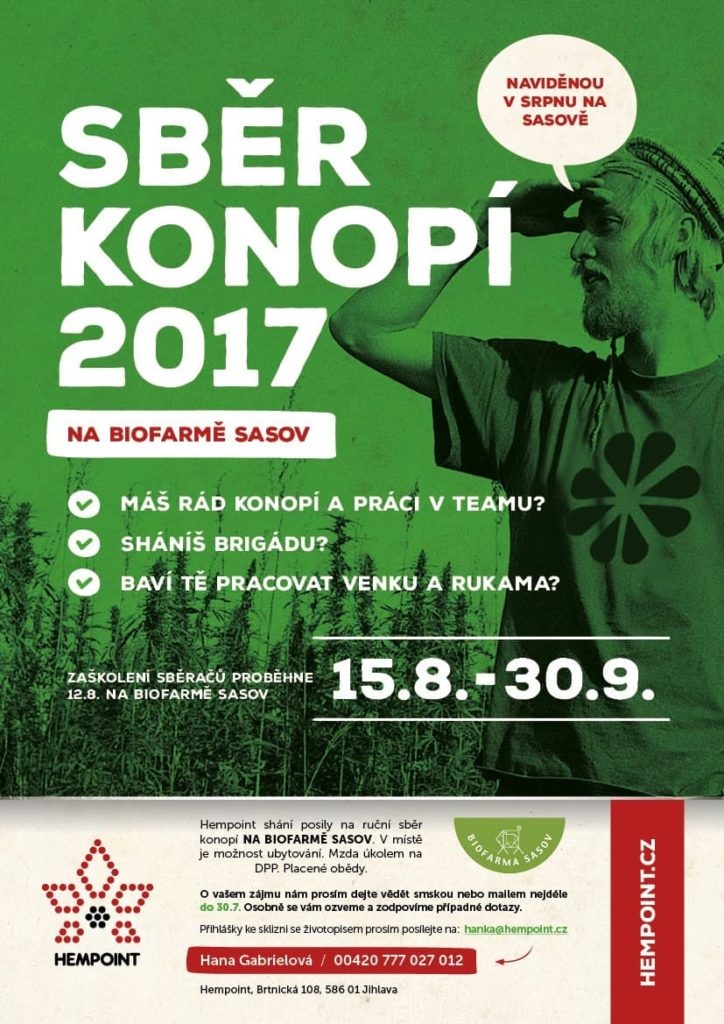Srdečně zveme na letošní ruční sklizeň konopí na Biofarmě Sasov, která začíná dne 12.8. zaškolením sběračů. V místě je možnost ubytování. Mzda úkolem na DPP. Placené obědy. SBĚR TRVÁ DO 30.9.2017!