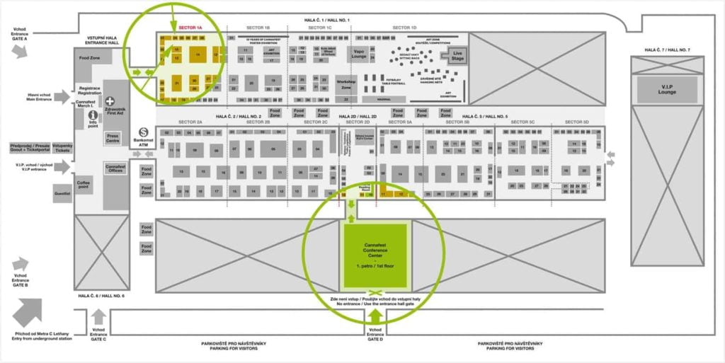 Mapa pro snadnější orientaci v areálu – levém horním rohu vidíte umístění našeho stánku číslo 4 v rámci sektoru A1. Konferenční sál, kde se bude konat valná hromada najdete označený v dolní části obrázku uprostřed. Oba hlavní objekty zájmu jsme označili zeleným kruhem. Obrázek si můžete zvětšit rozkliknutím. (Vstup do konferenčního sálu je možný pouze z haly uvnitř, nikoliv přímo z parkoviště.)